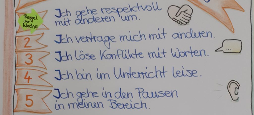 Klassen 5 und 6 legen eigene Klassenregeln fest und reflektieren deren Einhaltung jede Woche im Sozialen Lernen. Sie dürfen Konsequenzen vergeben und Schüler der Woche auszeichnen.